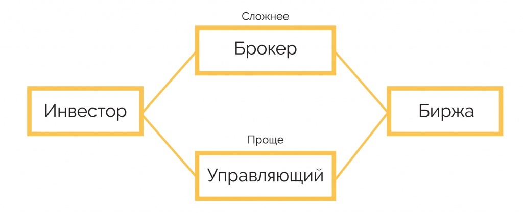 Если вы готовы пройти обучение инвестициям, погрузиться в тему, постоянно мониторить ситуацию на фондовом рынке, можете торговать самостоятельно. Тогда вам понадобится брокер, который станет вашим посредником для доступа к бирже. Вы будете сами принимать решения о покупке и продаже, а брокер — выполнять ваши поручения.
